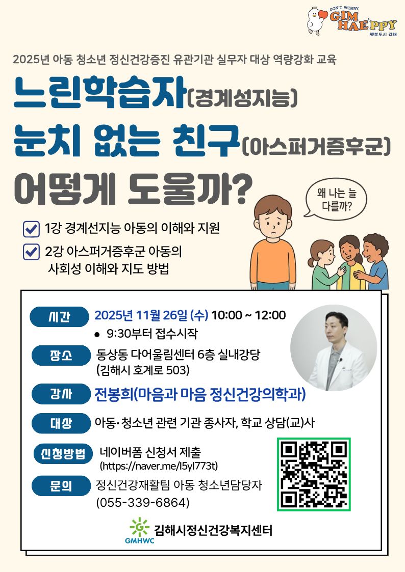 아동·청소년 마음건강 이해 교육 안내… 안녕하세요. 김해시정신건강복지센터입니다.김해시정신건강복지센터에서 관내 유관기관 실무자 대상으로 아동·청소년 정신건강증진 및..